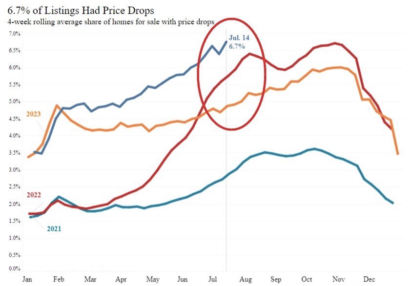 最新消息:过去四周内,美国待售房屋中6.7%的价格出现下跌,创历史新高。这超过了2023年和2022年最弱的4周期间的4.7%和5.6%的读数。由于买家等待抵押贷款利率和房价下跌,需求下降,导致房价下跌的比例增加。最近,30年期固定抵押贷款利率,从两周前的7.1%降至7月17日的6.8%。与此同时,房屋售价中值高达396,379美元,仅比上周的历史最高价低100美元。这个市场的买家正迅速消失。
