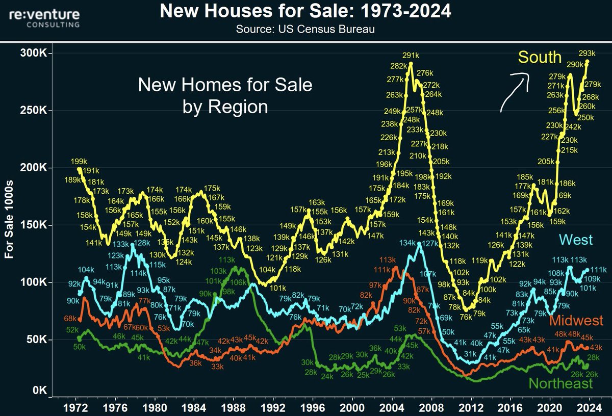 突发:美国南部新建住宅库存,正式超过2007年的水平,达到293,000套。事实上,目前所有待售新房的65%都在南部,主要是德克萨斯州和佛罗里达州。这正是为什么自2005年以来新房售价首次低于现有房屋的原因。当人们为旧房子支付更多钱时,你就知道房屋买卖不正常了。目前美国出售的每3套房屋中就有1套是新建房屋。与此同时,还有274,000套新住宅正在建设中。降价即将到来。
