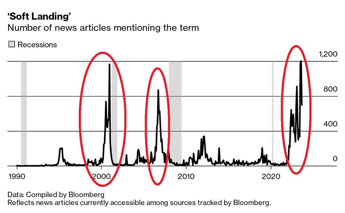 软着陆,能否实现?华尔街希望美国重现1995年软着陆。它总是以软着陆开始,然后该术语的提及次数激增。问题是,20世纪90年代中期,就业市场蓬勃发展,但现在却迅速恶化。即使巨额赤字,也无法阻止这一不可避免的结果。Still a soft landing? Wall Street hopes for a repeat of the 1995 U.S. soft landing. It always begins as a soft landing, and the term sees a spike in mentions. The issue is that in the mid-1990s, the job market was booming, while now it is deteriorating rapidly. Even significant deficits will not prevent the inevitable.