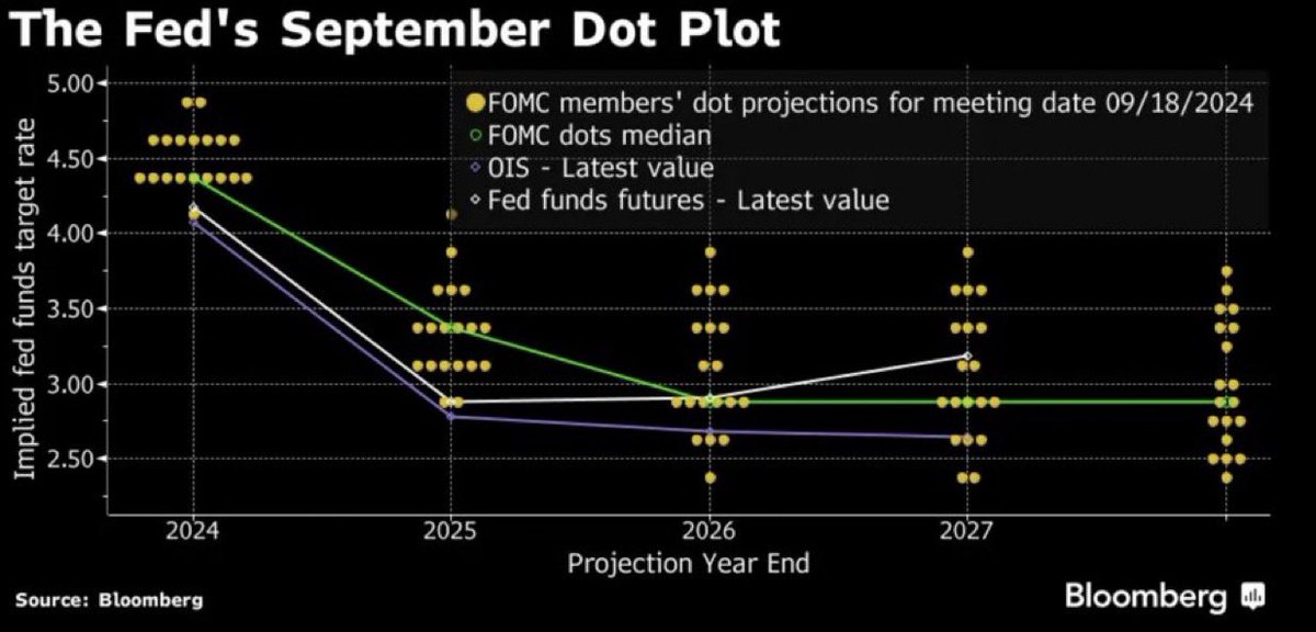 最新消息:美联储所谓的点图显示,美国央行用来表明其对利率走势的展望,年底联邦基金利率预测中值降至4.38%。NEW: The Fed’s so-called dot plot, which the US central bank uses to signal its outlook for the path of interest rates, shows the median year-end projection for the federal funds rate fell to 4.38%.