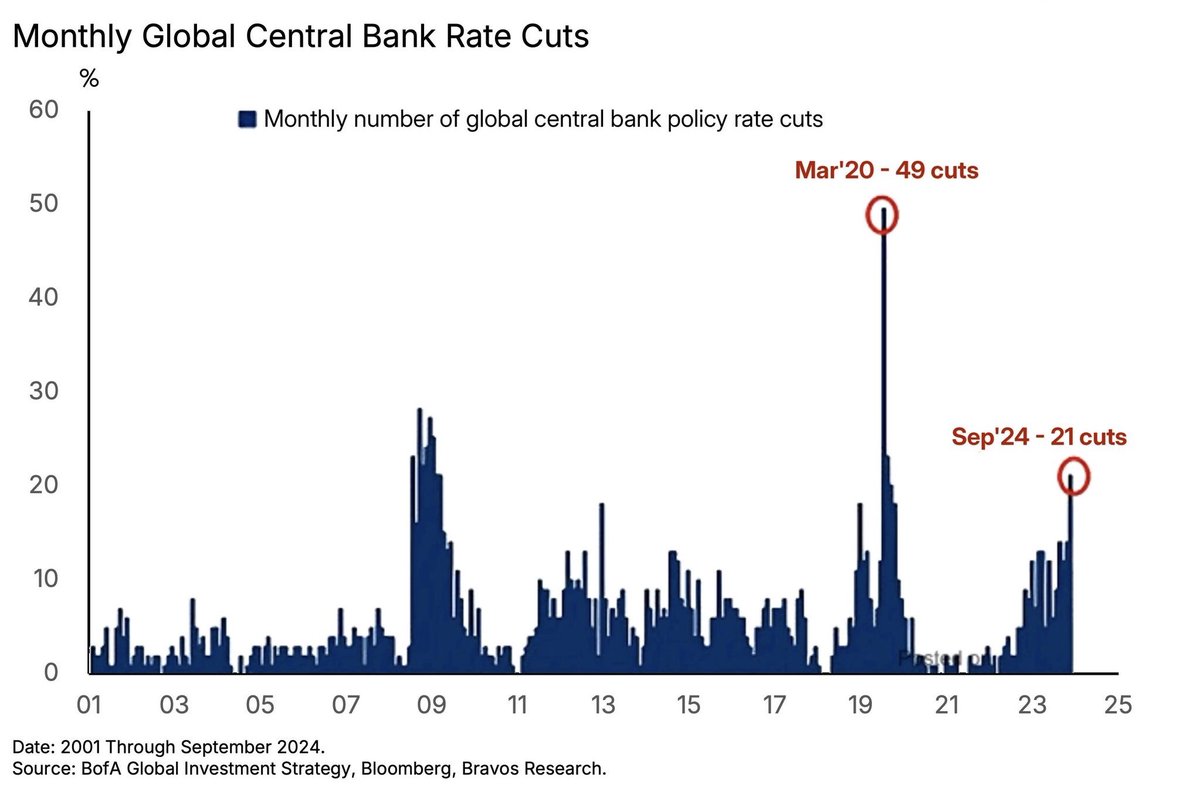 上个月,美联储自2020年3月以来首次降息,将联邦基金利率下调0.50个百分点至4.75%-5%区间。2024年9月,全球央行实施了21次降息,而2020年3月则降息49次。如果能够避免经济衰退,这一趋势对市场有利。Last month, the Federal Reserve made its first rate cuts since March 2020, lowering the federal funds rate by 0.50 percentage points to a range of 4.75%-5% . In September 2024, global central banks implemented 21 rate cuts, compared to 49 cuts in March 2020. If a recession can be avoided, this trend is bullish for the markets.