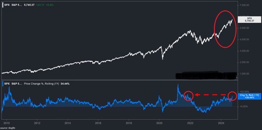 This has been one of the best market rallies ever, with the S&P 500 up 34.4% over the past year, the highest since October 2021. In the last 15 years, only the 2010 and 2021 bull markets performed better, following recoveries from the 2008 Financial Crisis and the 2020 pandemic crash. In 2021, the S&P 500 achieved 70 new all-time highs, the most since 1995. This year, it has already hit 42 records and is on track for the second-best streak since 2017.
