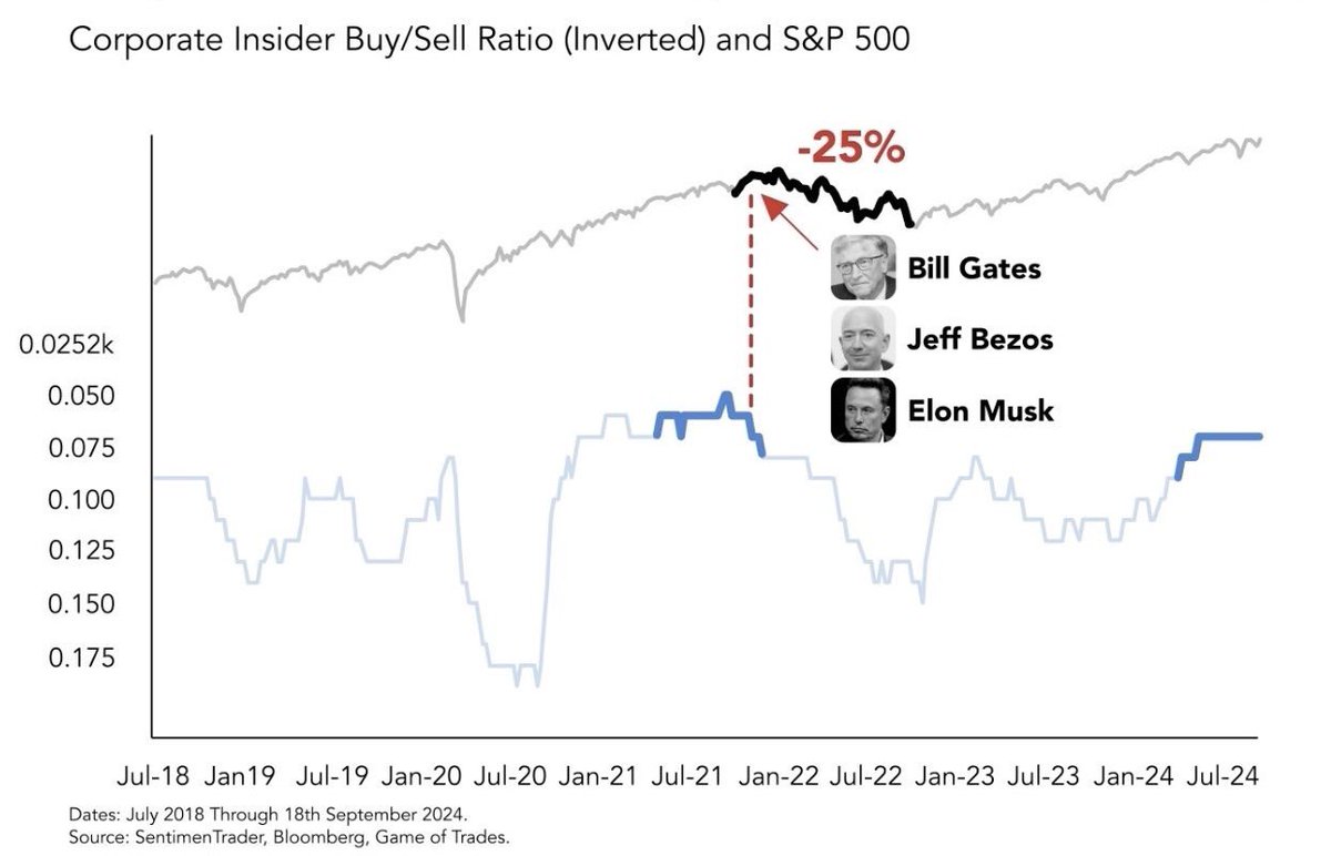 The corporate insider sell-to-buy ratio is at its highest since late 2021, a period when billionaire CEOs like Bill Gates, Jeff Bezos, and Elon Musk sold significant portions of their holdings, leading to a 25% market decline. Today, a similar trend is emerging, with Warren Buffett recently selling $6 billion in stocks and Michael Burry also trimming his portfolio. This situation does not bode well for the market.
