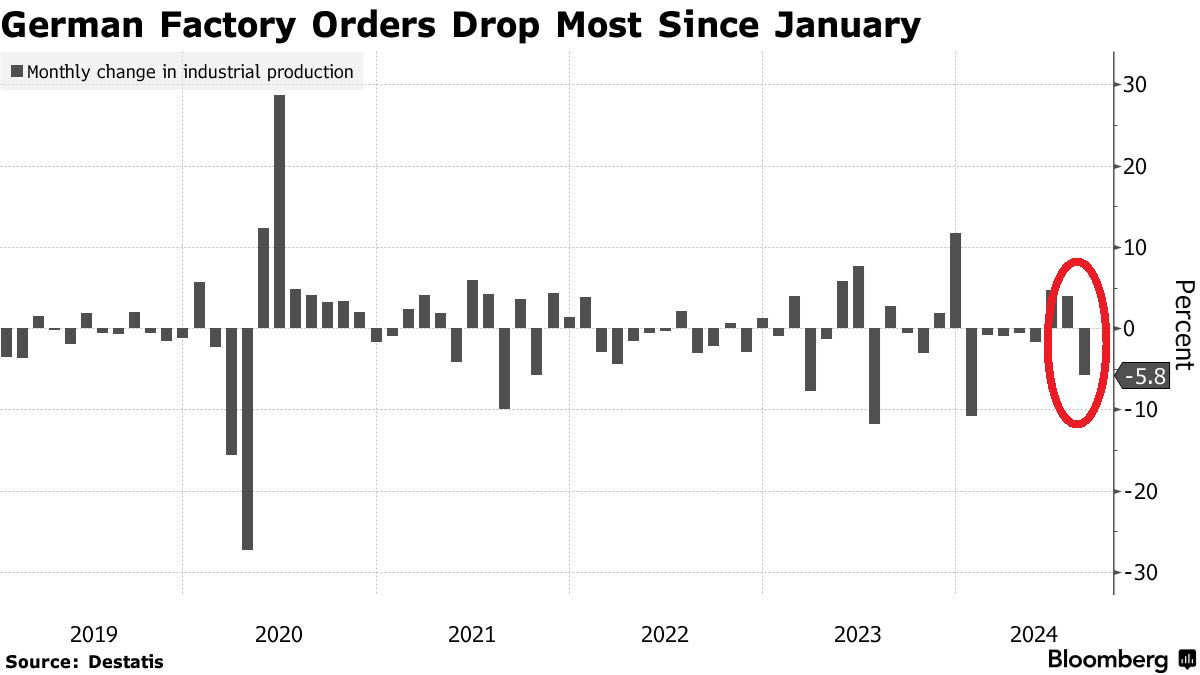 欧洲经济正在走弱。德国工厂订单出现自1月份以来的最大降幅,8月工业订单环比下降5.8%,降幅低于预期,是今年以来第二大降幅。全球第三大经济体仍有望连续第二年出现GDP萎缩。Europe's economy is weakening. German factory orders have experienced their largest decline since January, with industrial orders dropping by 5.8% month-over-month in August, which is lower than estimated and marks the second-biggest decline this year. The world's third-largest economy is still on track for a second consecutive year of GDP contraction.