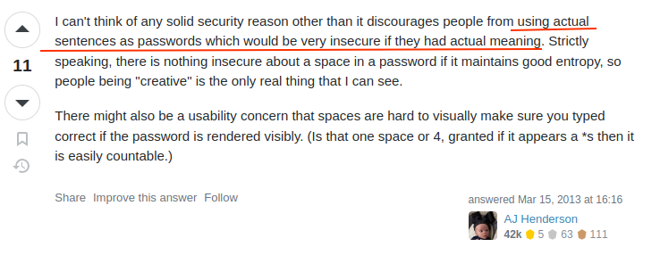 even if you claim there's some loss of randomness due to the patterns of letters and spaces -- which is true -- that's more than offset by how easy it is to remember and type out an *extremely long password*