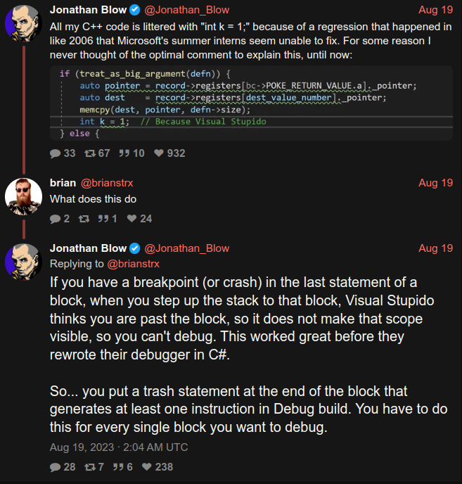 now that remedybg (debugger) exists I really only need visual studio for either other people's project shit or the compiler alone, which I run from the command line