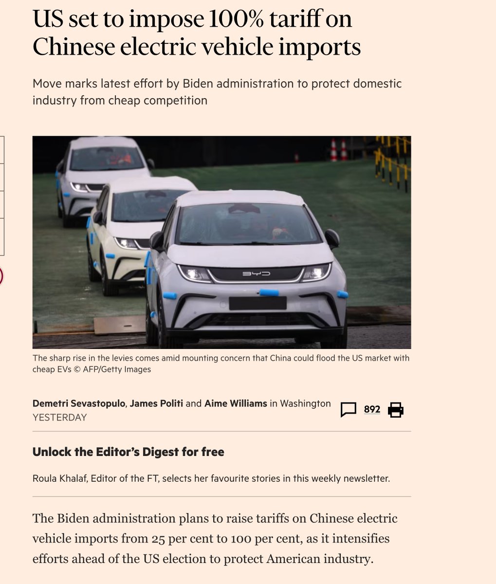FT:美国正在计划对中国生产的电动车施加100%的关税 https://t.co/oYb6A789HH