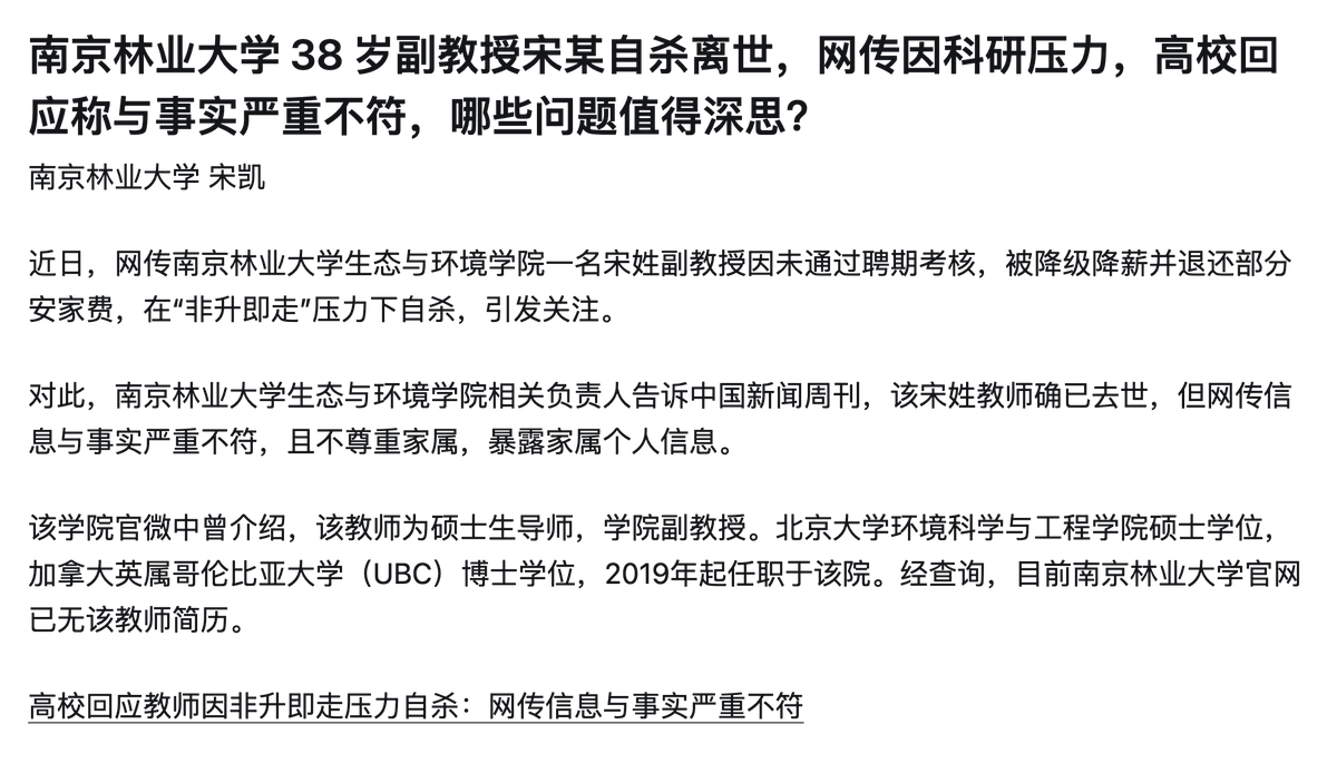 当很多人去为南京林业大学宋教授默哀的时候,我也想跟你们说,哪怕学校要求退还安家费等协议不对,在这些人毕业的那个系里,90%的PhD是找不到tenure-track的AP职位的——当年这批人打包回国进高校,一次性拿到几十万上百万大包裹,回国在二线城市高校里面退休养老,这是一个巨大的privilege,跟他们在PhD期间发的那些paper,和任职之后持续的学术产出相比,压根就不匹配。