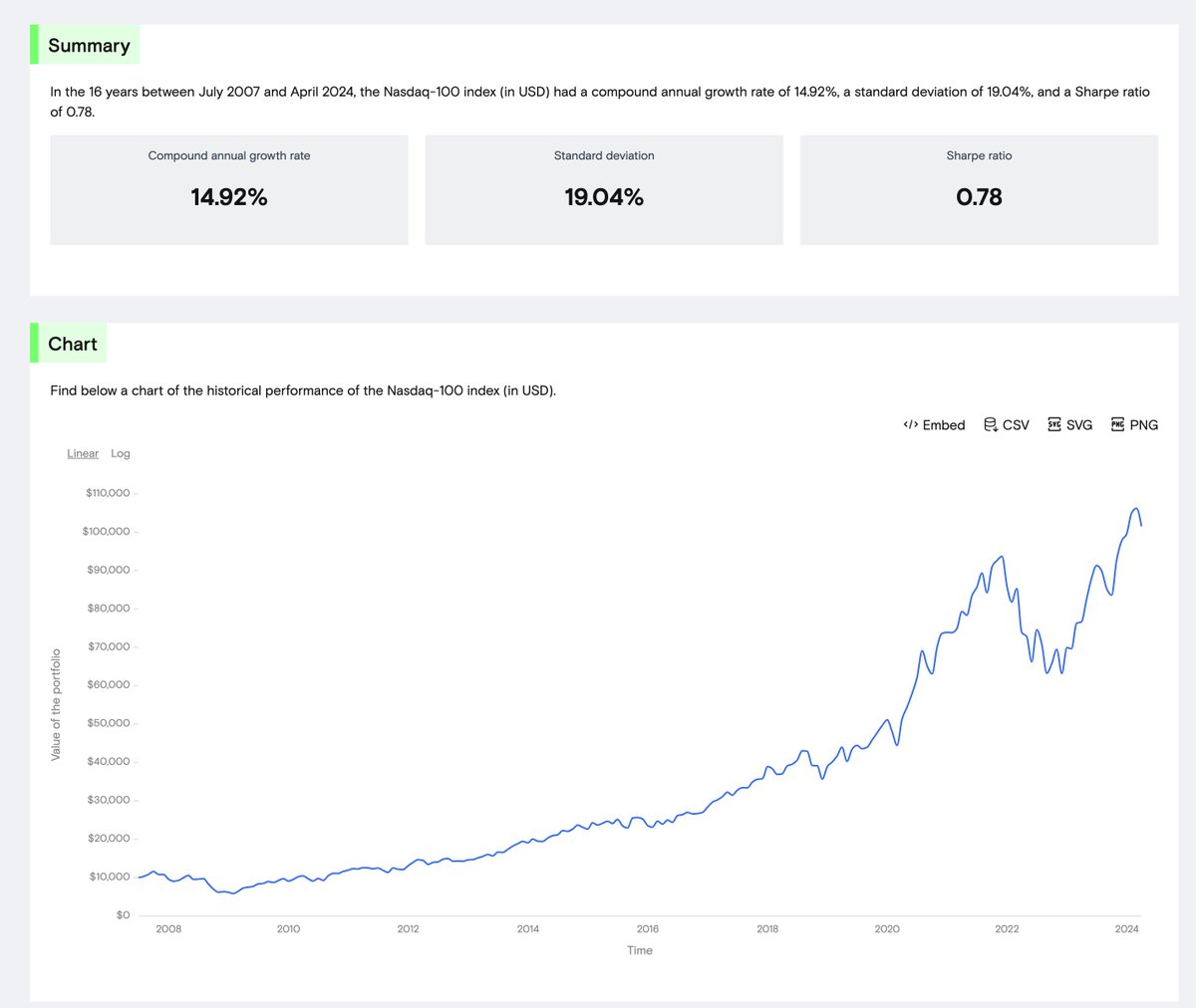 图2:纳斯达克100的过去17年,平均回报率是14.92%。