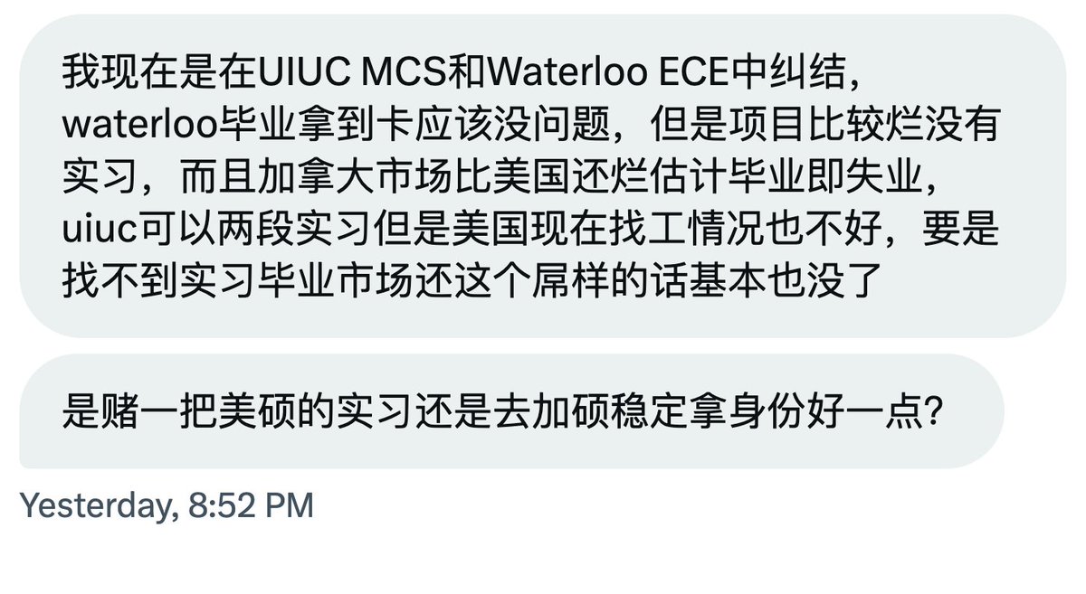 当你没有任何经验、经历、背景、关系的时候,哪怕UIUC MCS和Waterloo的ECE,也基本是死路一条。 https://t.co/a9jqoijaMd