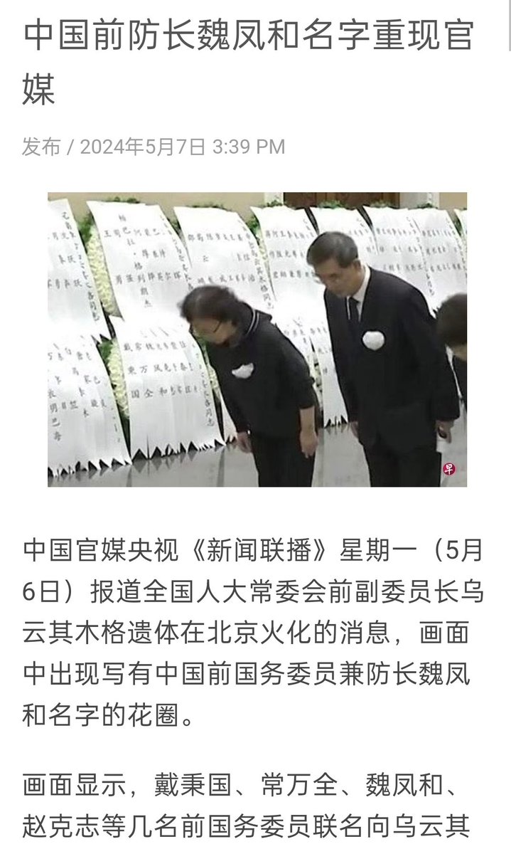 因为在乌云其木格的遗体告别仪式上,新华社和新闻联播的官方现场视频中,明确显示了魏凤和的名字。