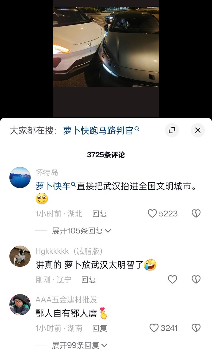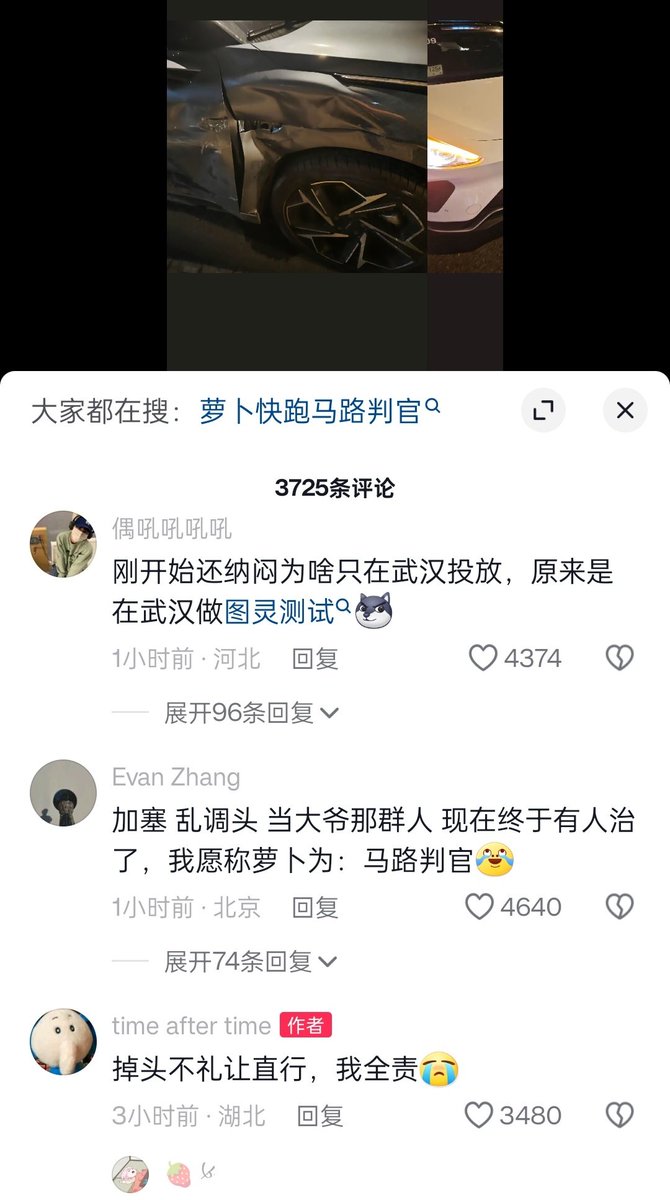 只有武汉人自己感谢百度,是百度把武汉抬进了全国文明城市,毕竟99.9999%车祸都是司机全责,现在武汉人开车已经规矩多了,夸奖萝卜是“马路判官”。 https://t.co/Q1LfXmN29m