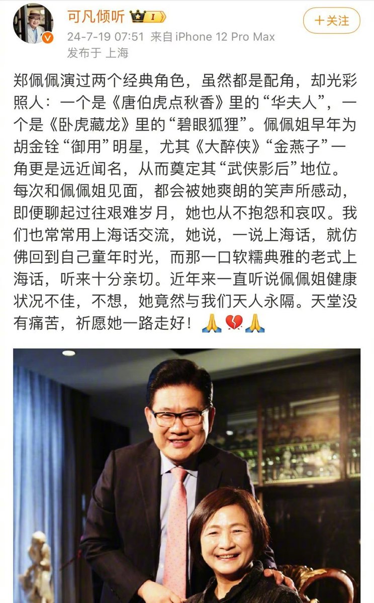 据曹可凡微博曝光,演员郑佩佩逝世 https://t.co/C2NnMW5IFf