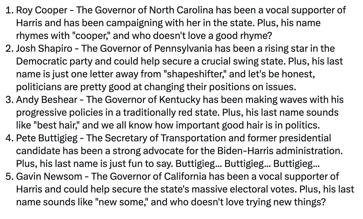 Grok预测的Harris的五个VP人选 https://t.co/ydt7KuortN