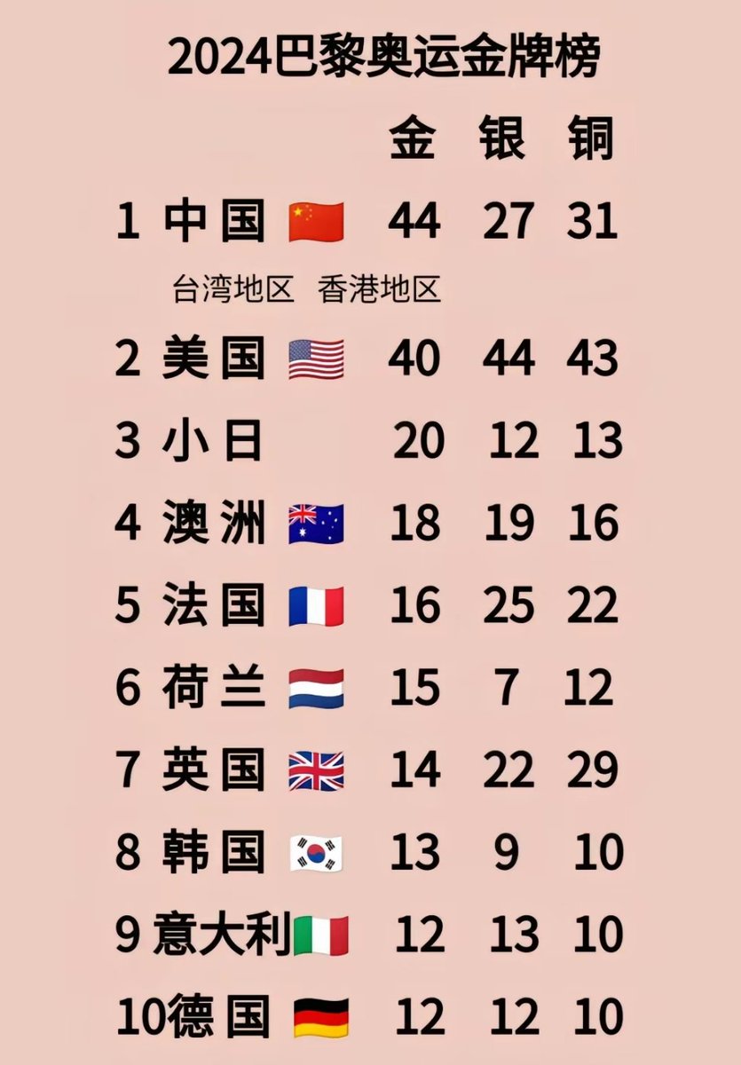 已知:小粉红认为,中国队金牌榜必须把台湾和香港加进来,于是中国队总共44枚,高居金牌榜榜首;