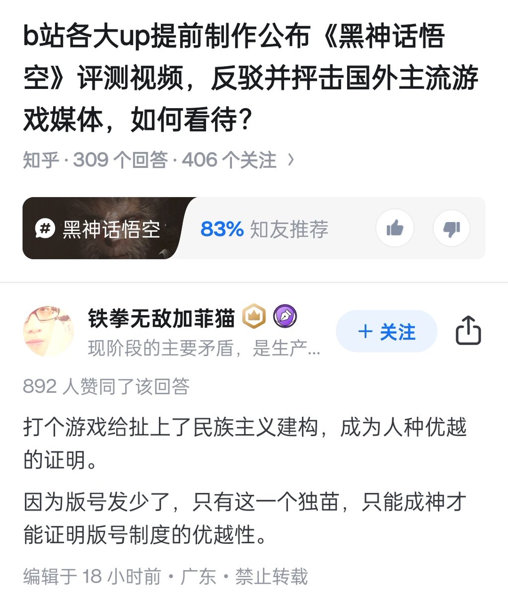 按着别人脑袋去要求别人“承认《黑神话》是10分,是满分”,这波流量迟早会跟华为5G和“微内核形式化验证的分布式云AI操作系统鸿蒙”一样被反噬。