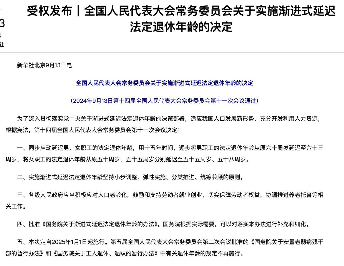《全国人民代表大会常务委员会关于实施渐进式延迟法定退休年龄的决定》