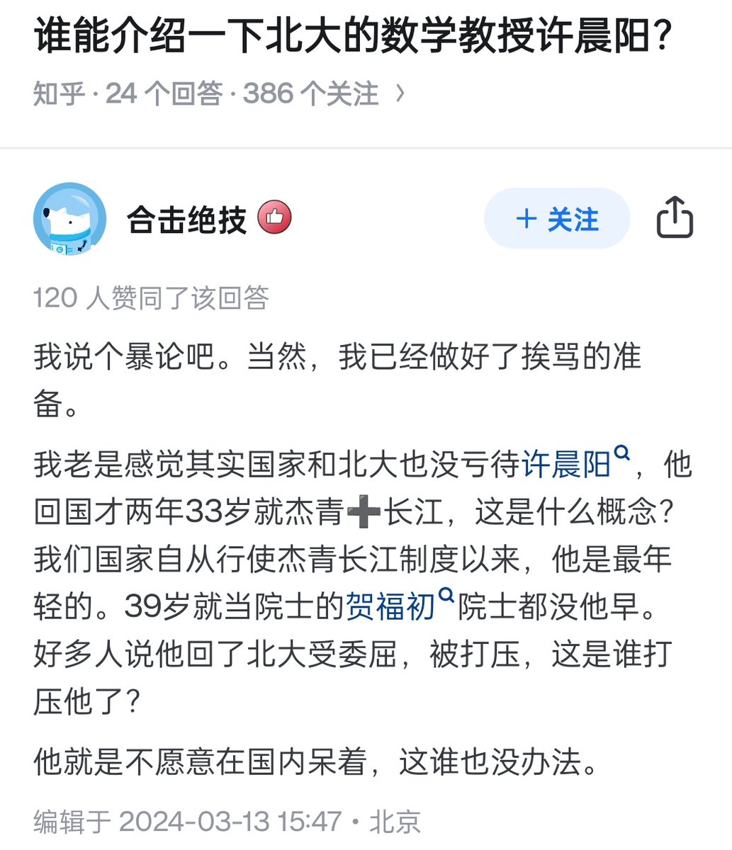 许晨阳放弃北大回普林斯顿是不知好歹,是他自己觉得自己被打压,实际上对他待遇一点都不差。