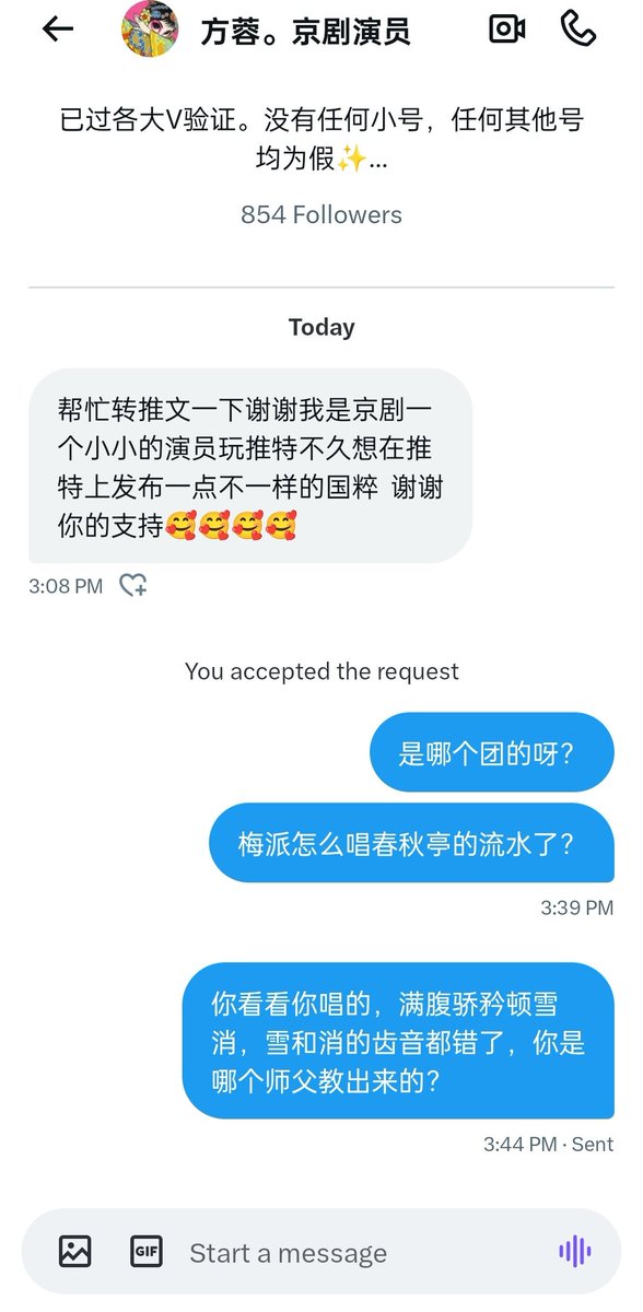 这个人自称梅派京剧演员“方蓉”,一堆艺术照,贴telegram,张嘴就腆着脸要我转发,