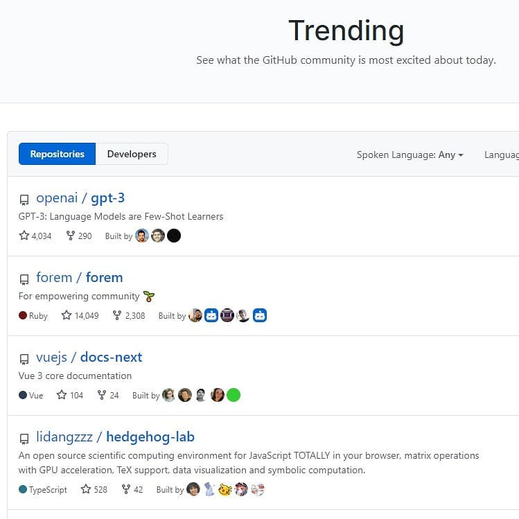 就是2020年6月份,GPT-3已经冲上github trending的榜一了,而同一天我是榜四,
