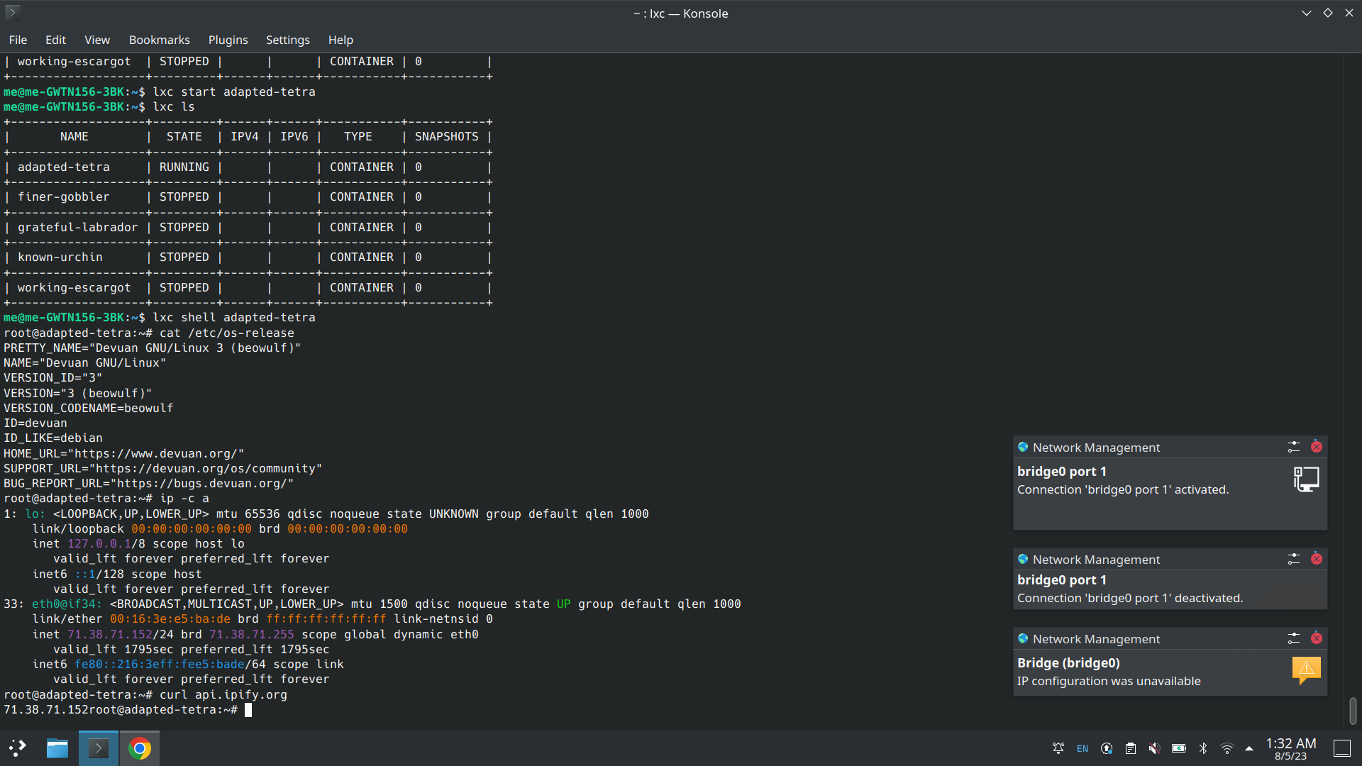 idk it wasnt working, maybe picked up when i was messing around but im still not getting an ip on bridge even after stopping lxd