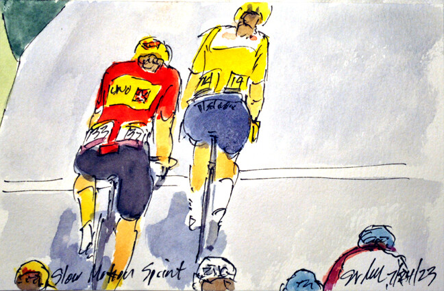 "Slow Motion Sprint" @LotteKopecky @teamsdworx in her @MaillotjauneLCL taking the best of the rest sprint in Stage 2 of @LeTourFemmes ahead of @confa_mg @UnoXteam is for sale at https://www.greigleach.com/large-multi-view/Tour-de-France--Tour-de-France-Femmes-2023/3967567-152-297438/Painting/slow-motion-sprint-tdff23-8.html #TDFF2023 #cycling #art #watercolors #womenscycling #cyclisme #ciclismo #wielrennen #vrouwenwielrennen #ciclismofeminino