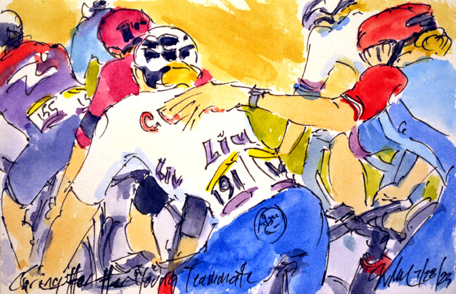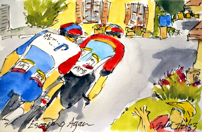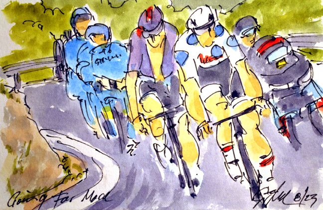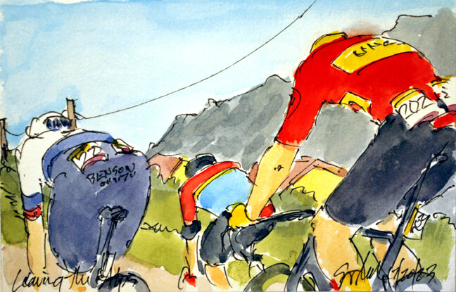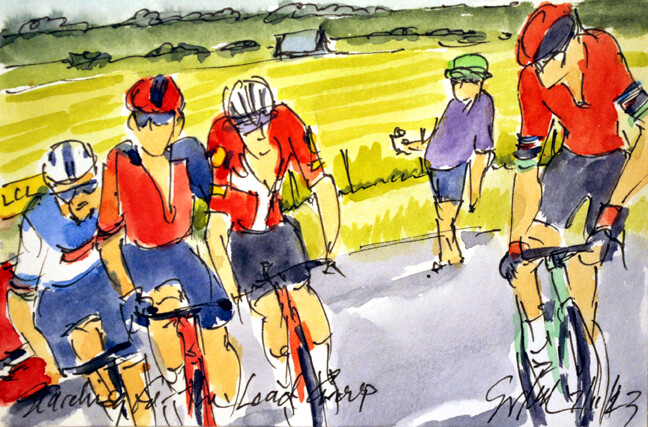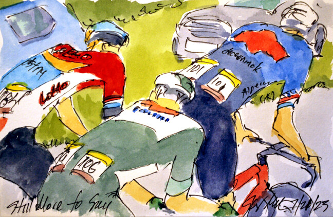 "Do You See Who Is Coming?" @alafpolak1 @soudalquickstep asking @MATTEOTRENTIN @TeamEmiratesUAE who is coming to join them & @jackhaig93 @BHRVictorious amongst others is available at https://www.greigleach.com/large-multi-view/Tour-de-France--Tour-de-France-Femmes-2023/3966634-127-297438/Painting/do-you-see-who-is-coming-tdf23-127.html #TDF2023 #cycling #art #watercolors #cyclisme #ciclismo #wielrennen