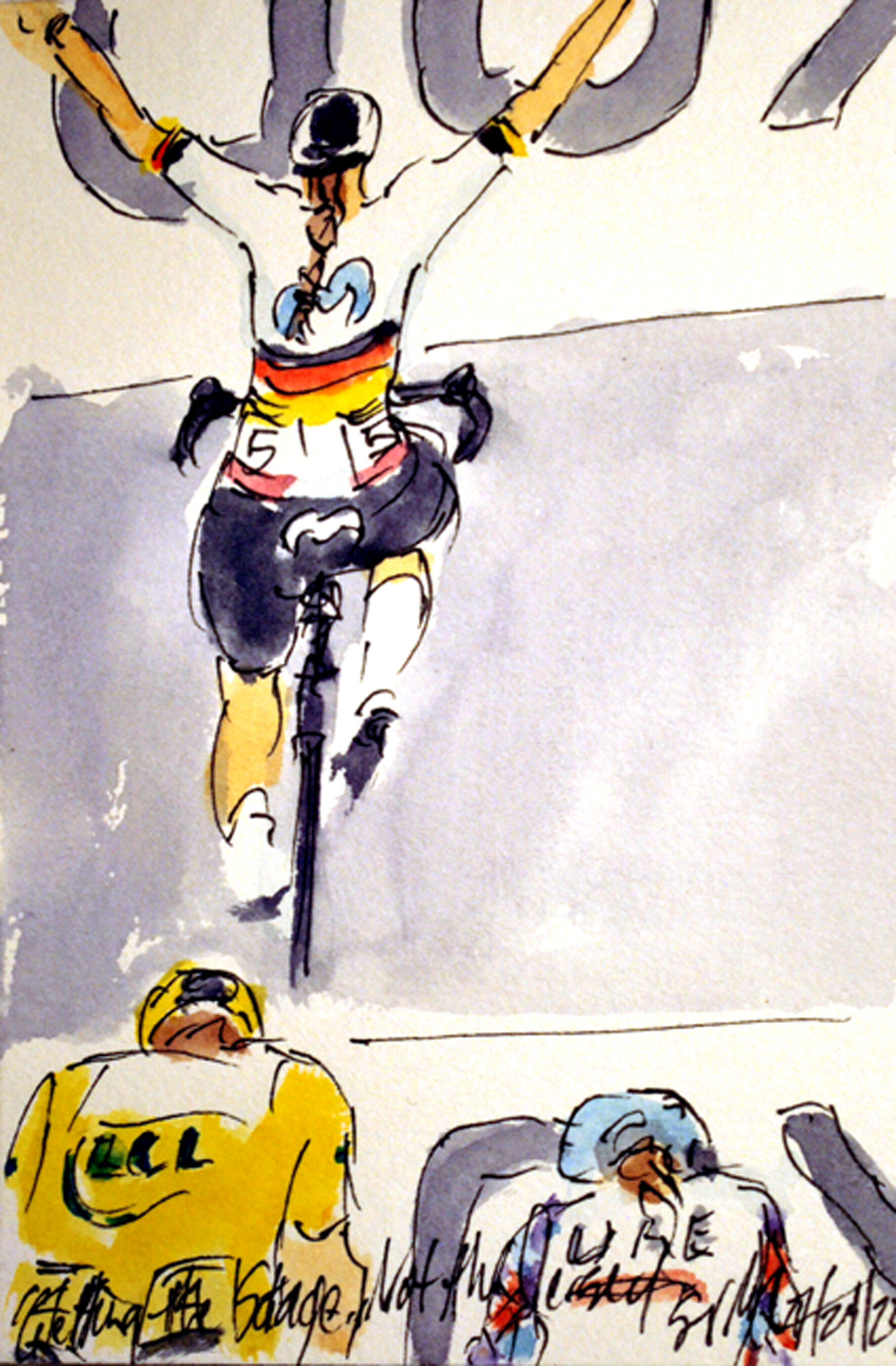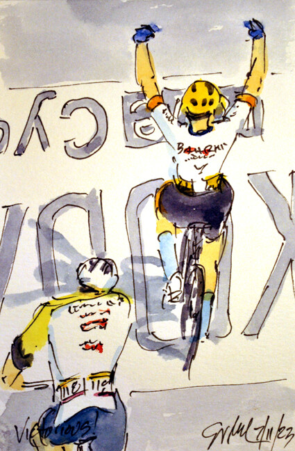 "Victorious!" @PelloBilbao1990 @BHRVictorious winning in Issoire ahead of Georg Zimmermann @IntermarcheCW is still available at https://www.greigleach.com/large-multi-view/Tour-de-France--Tour-de-France-Femmes-2023/3965004-61-297438/Painting/victorious-tdf23-61.html @LeTour #TDF2023 #cycling #art #watercolors #cyclisme #ciclismo #wielrennen @SKODAUK