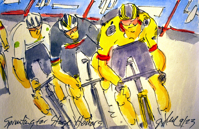 "Sprinting for Stage Honors" It is @rogla @JumboVismaRoad taking stage 8 in @lavuelta ahead of @EvenepoelRemco @soudalquickstep & J Ayuso @TeamEmiratesUAE, but @seppkuss takes the Red Jersey. This & more #LaVuelta23 #cycling #art is here: https://www.greigleach.com/large-multi-view/Vuelta-a-Espana-23/3979844-14-298253/Painting/sprinting-for-stage-honors-v23-14.html #ciclismo #cyclisme #wielrennen #watercolors