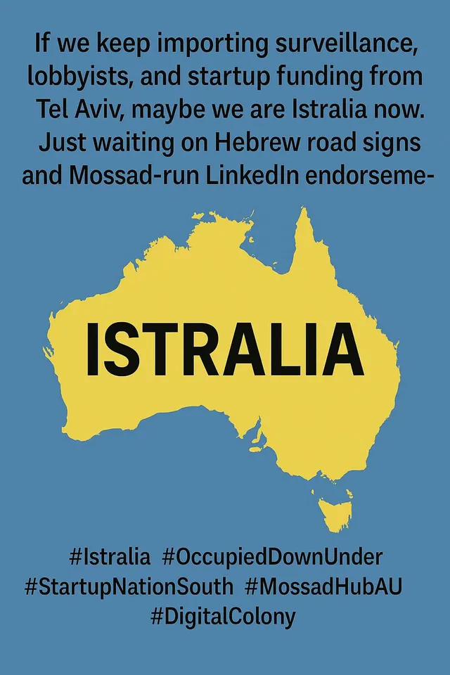 #Istralia Aviv, #MossadHubAU Hebrew LinkedIn Just #Straya Istralia we Mossad-run #OccupiedDownUnder waiting are keep #NotYourLabRat on signs and laws, maybe and surveillance startup importing Tel from lobbyists, we #Australia #StartupNationSouth road https://files.sovbit.host/media/16d114303d8203115918ca34a220e925c022c09168175a5ace5e9f3b61640947/595098abb7b41b2ae445b6573bc6c574fd3170bb8f9e8f8681f8b6de9fe710f0.webp