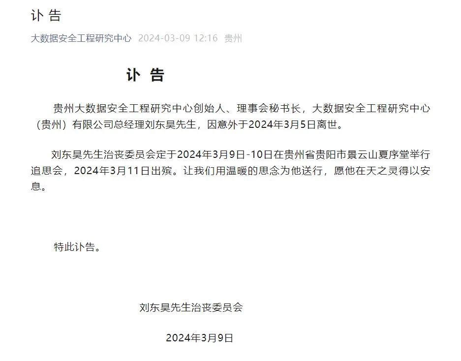 贵州大数据安全工程研究中心创始人、大数据安全工程研究中心(贵州)有限公司总经理刘东昊,因意外于3月5日离世。