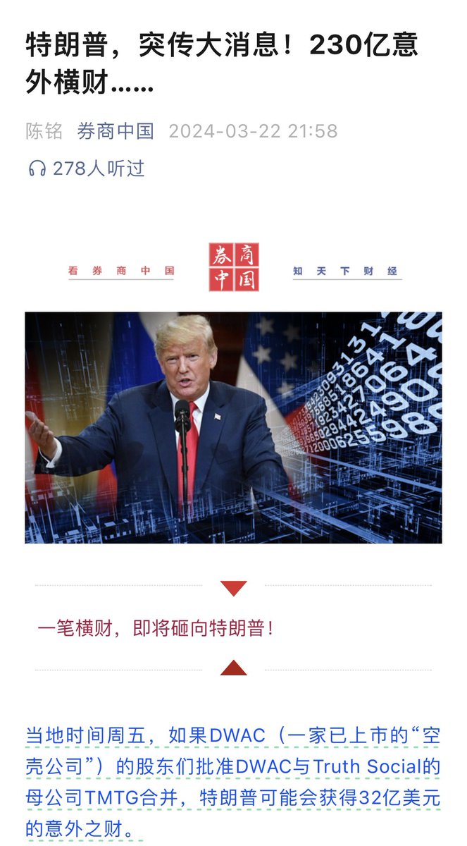 感觉川普正在掉入一个精心设计的陷阱,DWAC是中共国安吴征投资的,川普如果接受这笔资金,就等于是拿了中共国安部的钱,未来随时会做实“通共”卖国的罪,不拿这笔钱,就会被没收资产!