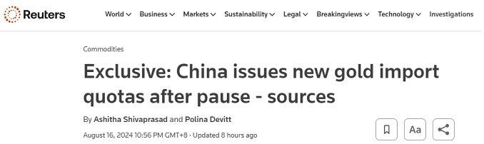 路透社8月16日发布独家报道称,几家中国银行已从央行获得新的黄金进口配额,该配额是在8月份发放的,此前暂停了两个月