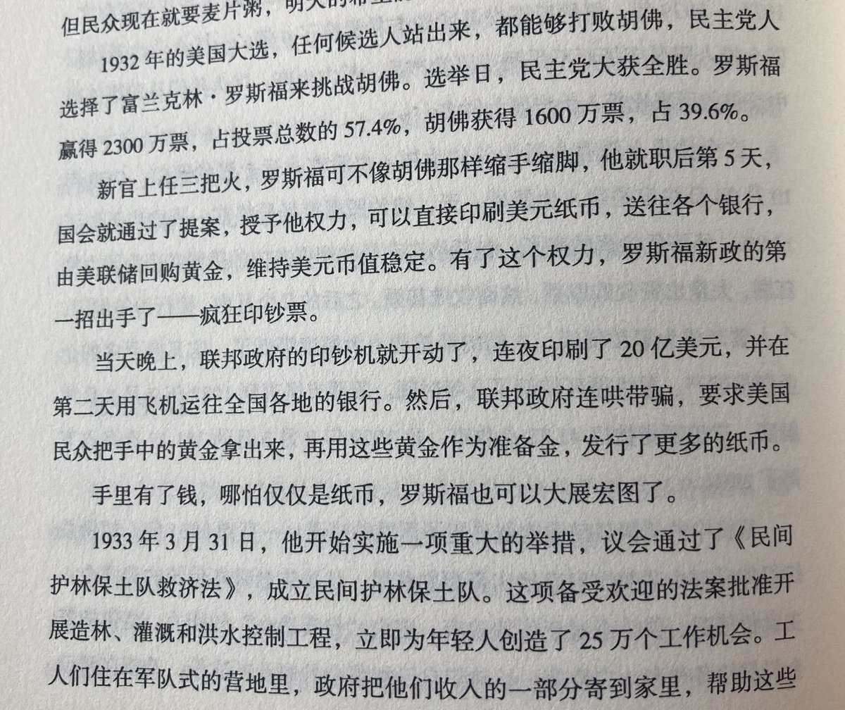 1933年罗斯福上任第五天,国会就通过法案,授权他直接印刷美元,当天晚上就有20亿美元,用飞机运往全国各地,然后为了维持美元购买力。