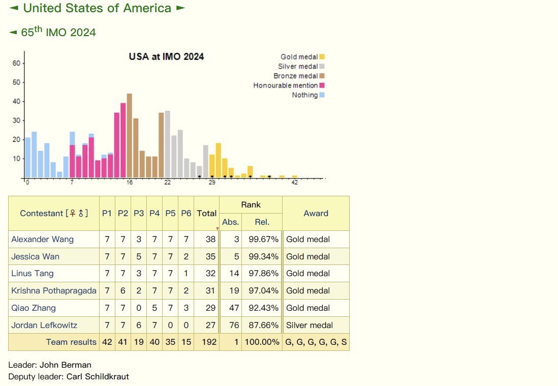 不可忽視的海外華裔。第65屆國際數學奧林匹克競賽(IMO)結果:美國獲得今年奧數比賽團體第1名,中國第2,韓國第3,印度第4,白俄羅斯第5。美國隊前3名都是華人小孩,第2名是位華人小姑娘。中國隊6位選手,共獲5枚金牌和1枚銀牌,並以190分的總分獲得團體總分第2名,未能實現六連冠,但敗給了海外華裔。 https://t.co/aPpimKP32g