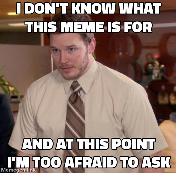 ', 'preview': "Generated meme with template 'Afraid to Ask Andy'\nTop text: Is this thing on~q\nBottom text: How do I meme~q", 'template_info': {'name': 'Afraid to Ask Andy', 'lines': 2, 'styles': [], 'source': 'http://knowyourmeme.com/memes/afraid-to-ask-andy', 'example': {'text': ["i don't know what this meme is for", "and at this point i'm too afraid to ask"], 'url': "