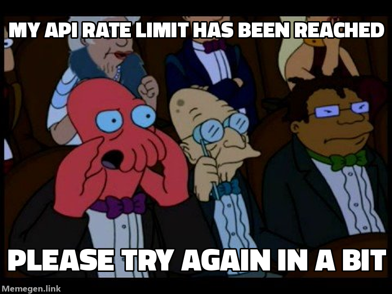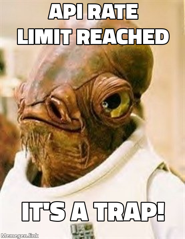", 'line_content': "Top text: API Rate Limit Reached\nBottom text: It's A Trap!", 'template_info': {'name': "It's A Trap!", 'lines': 2, 'styles': [], 'source': 'http://knowyourmeme.com/memes/its-a-trap', 'example': {'text': ['', "it's a trap!"], 'url': "