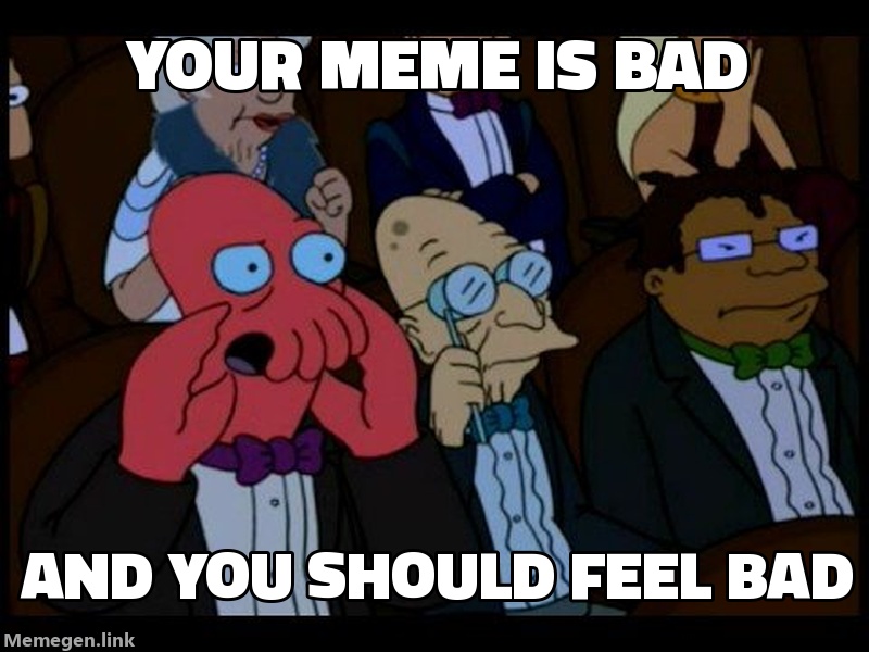 ', 'line_content': 'Top text: My API rate limit has been reached\nBottom text: Please try again in a bit', 'template_info': {'name': 'You Should Feel Bad', 'lines': 2, 'styles': [], 'source': 'http://knowyourmeme.com/memes/your-musics-bad-and-you-should-feel-bad', 'example': {'text': ['your meme is bad', 'and you should feel bad'], 'url': '