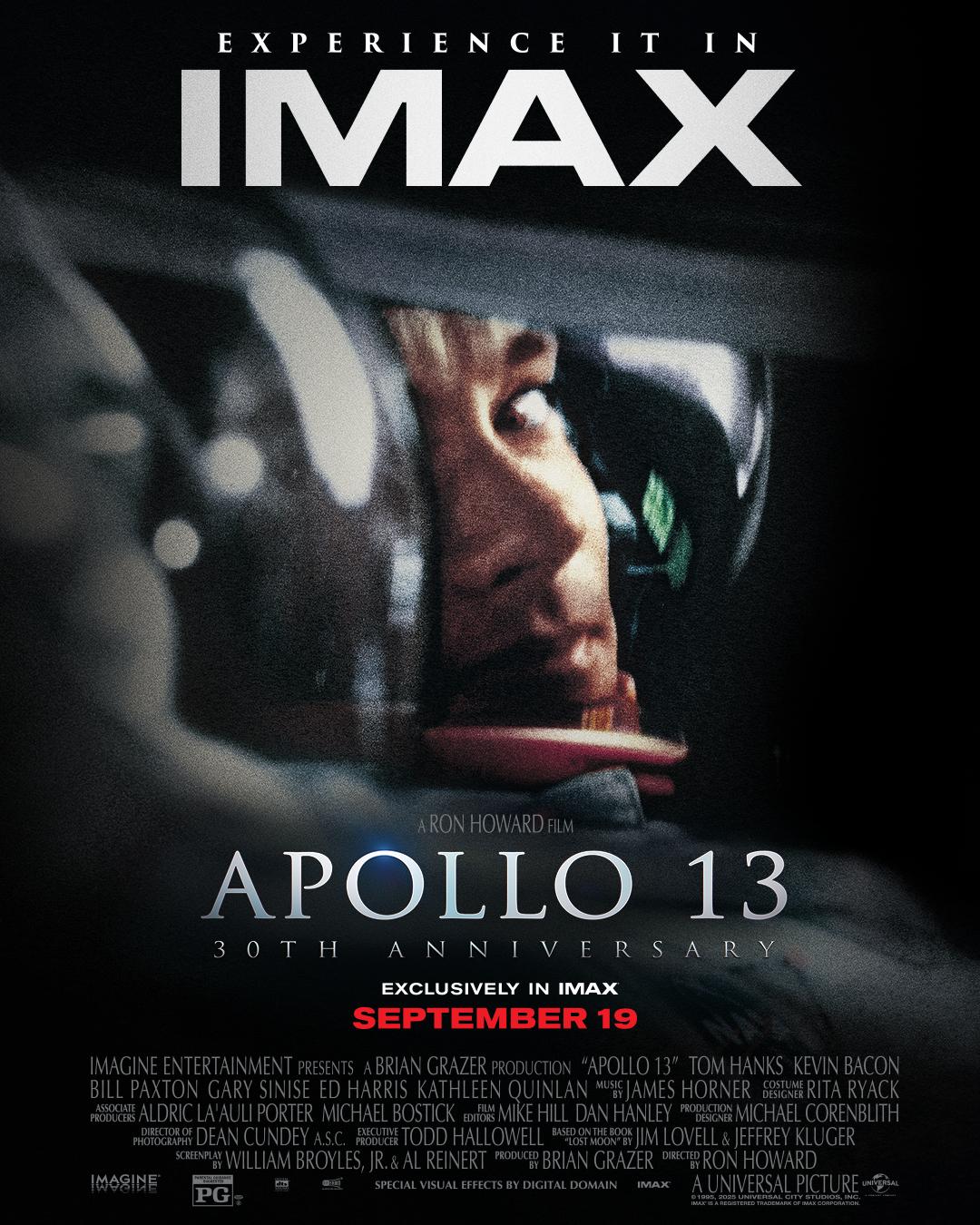 #阿波罗13号北美重映 为庆祝《阿波罗13号》上映30周年,环球影业将重映本片IMAX版本,9月19日重返北美大银幕,并将在IMAX影院独家放映至9月25日。