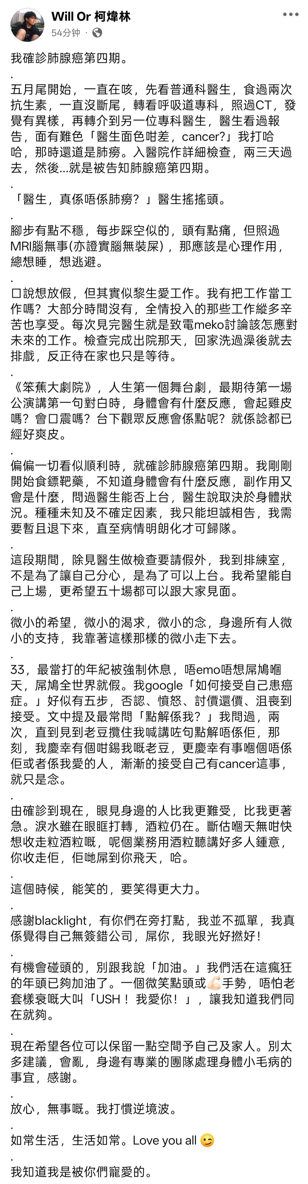 #柯炜林确诊肺腺癌 香港演员柯炜林在社交平台发文公布自己确诊肺腺癌第四期 [惊恐] 柯炜林乐观回应道:在这样的时刻,要笑得更大声。如常生活,生活日常,Love you all