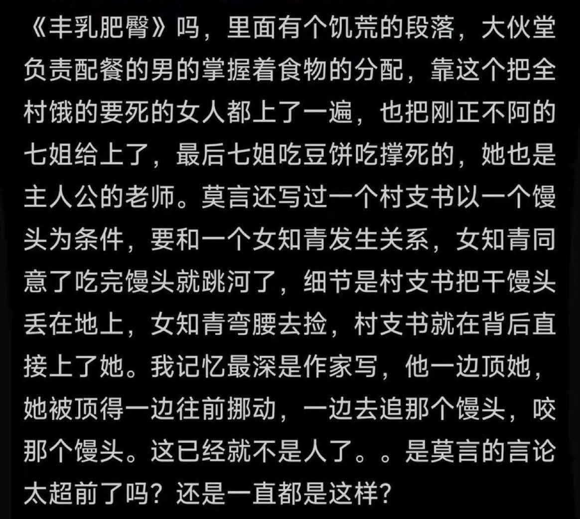 莫言写过一个村支书以一个馒头为条件,要和一个女知青发生关系,女知青同意了吃完馒头就跳河了,细节是村支书把干馒头丢在地上,女知青弯腰去捡,村支书就在背后直接上了她。我记忆最深是作家写,他一边顶她,她被顶得一边往前挪动,一边去追那个馒头,咬那个馒头。 https://t.co/t3bHhtU6eU