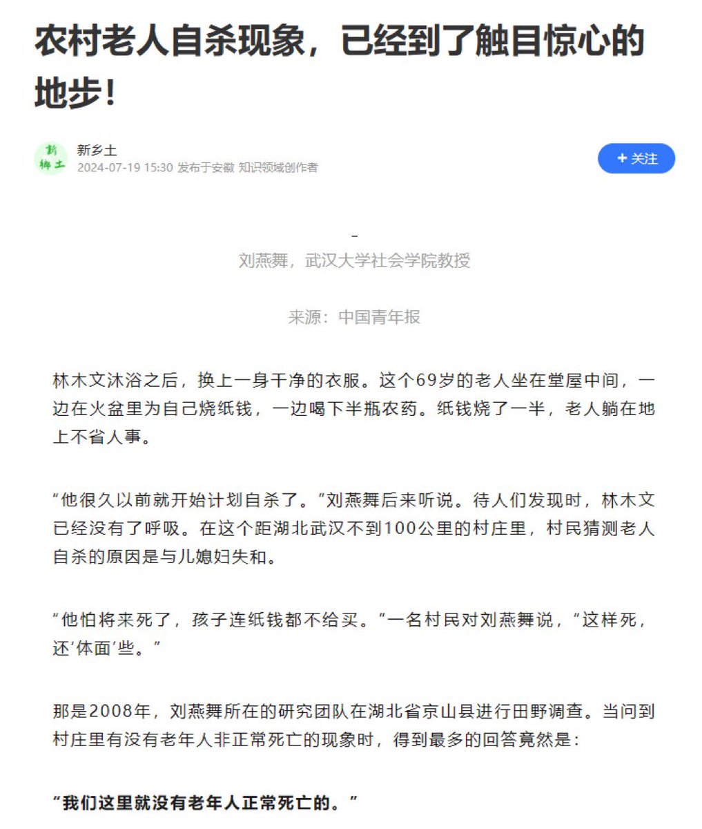 中国农村老人自杀率是世界平均水平4到5倍。在一个GDP全球第二、国民人均收入迈入“中等偏上”的国家,农村老人频频自杀是整个社会的耻辱。