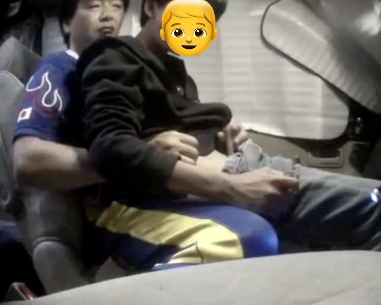おっさんが車内で若い男の子のチンポを扱く。若い男の子は、おっさんの手の上で射精する。(10分43秒)