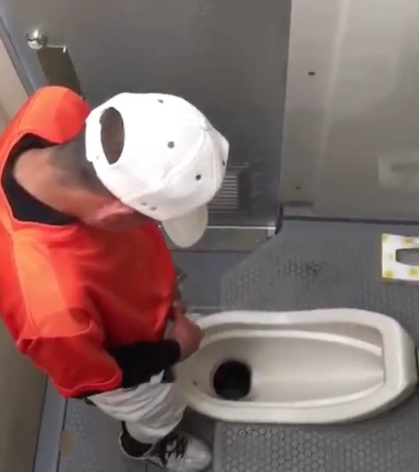 A scene of four athletic guys peeing in the toilet, observed from above (2 minutes 36 seconds)