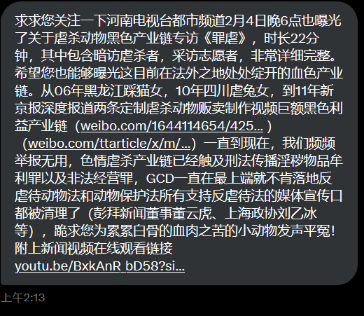 网友投稿:河南电视台都市频道曝光了关于虐杀动物黑色产业链专访《罪虐》,时长22分钟,其中包含暗访虐杀者,采访志愿者,非常详细完整。希望您也能够曝光这目前在法外之地处处绽开的血色产业链。从06年黑龙江踩猫女,10年四川虐兔女,到11年新京报深度报道两条定制虐杀动物贩卖制作视频巨额黑色利益产业链(https://t.co/WYx65igREc )(https://t.co/qbI8o2JnfU)一直到现在,我们频频举报无用,色情虐杀产业链已经触及刑法传播淫秽物品牟利罪以及非法经营罪,中国政府一直在最上端就不肯落地反虐待动物法和动物保护法所有支持反虐待法的媒体宣传口都被清理了(澎湃新闻董事董云虎、上海政协刘乙冰等),希望您为累累白骨的血肉之苦的小动物发声平冤!附上新闻视频在线观看链接 https://t.co/mTnvPo1dXz