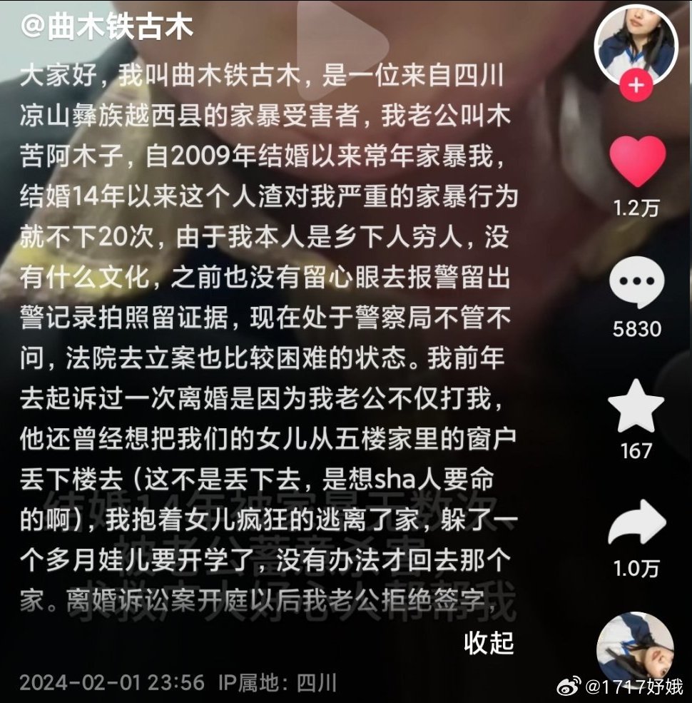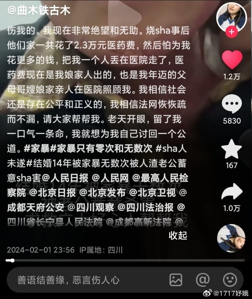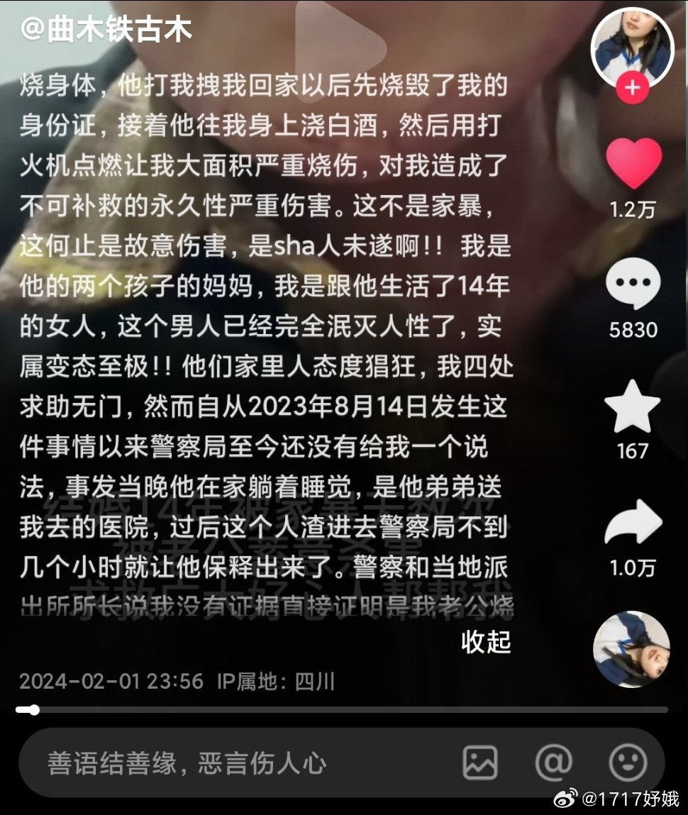 2009年至今,她和老公木苦阿木子结婚十多年,被家暴多次,但因文化低,得过且过心理,当时没有保留证据,直到2023年家暴男变本加厉想谋杀她,白酒点火造成她大面积烧伤。
