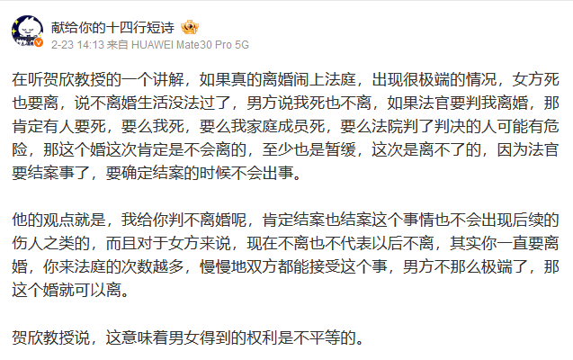 还有很多观点,一直在听,能理解其实离婚诉讼这里,婚姻其实是为了稳定,法庭也是在维持稳定,但这个过程里基本上都是女性在遭受伤害,婚姻对女方是不平等的。很多情况就不能公平。