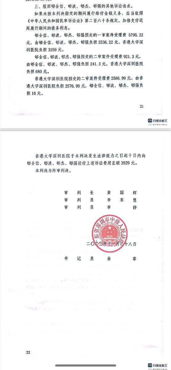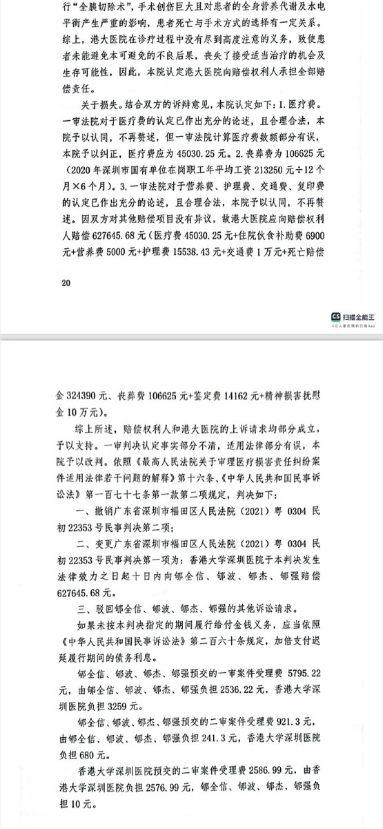 2023年11月28日,深圳市中级人民法院作出终审判决:判决香港大学深圳医院承担全部的赔偿责任。要求香港大学深圳医院于本判决发生法律效力之日起十日内向受害人家属赔偿627645.68元,该赔偿已执行。