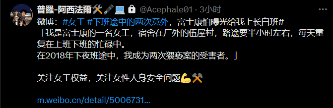 微博:#女工 #下班途中的两次意外,富士康怕曝光给我上长白班# 「我是富士康的一名女工,宿舍在厂外的伍屋村,路途要半小时左右,每天重复在上班下班的忙碌中。 在2018年下夜班途中,我成为两次猥亵案的受害者。」 关注女工权益,关注女性人身安全问题💪