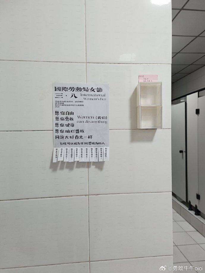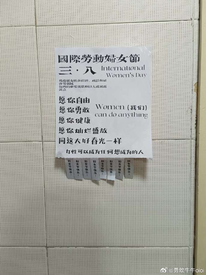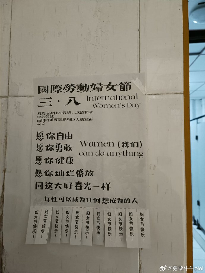 网友投稿:中华女子学院,一所教授女性学的学校,反对女权主义的男性却能做校区的领导人,并且在三月七号撕下女同学们所张贴的具有鼓励和庆祝意味的海报,张贴海报的女同学被约谈,被盘问,被指责受到反动势力的蛊惑和利用,其他同学被禁止发布相关内容,同时被要求在参与其他妇女节庆祝活动之前必须向上级报备。女性的独立意识到底戳到了谁的痛点,触碰到了谁的利益,让女性连互相鼓励携手并进都需要如同秘密组织般暗中活动?